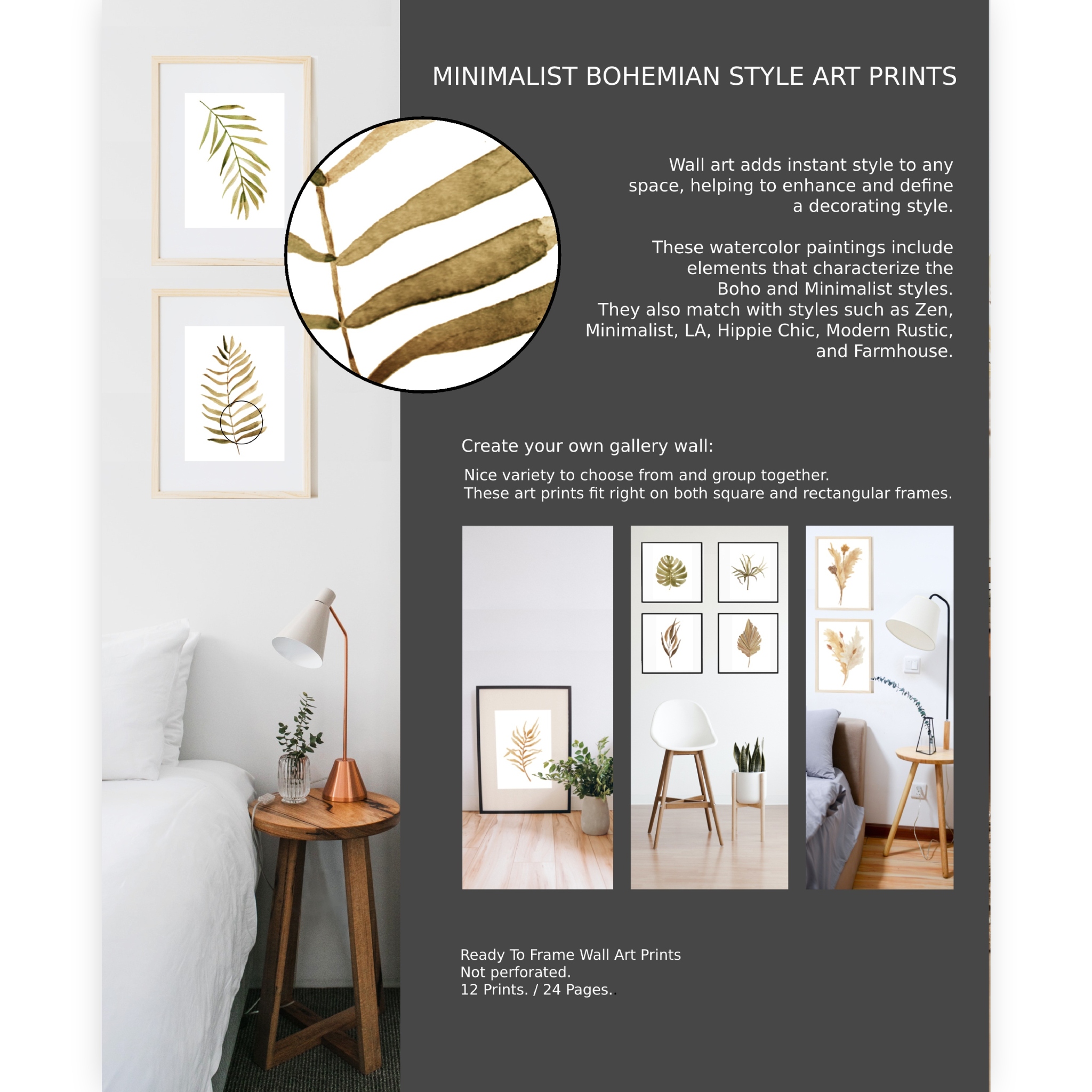 This selection includes prints of watercolor paintings representing individual elements that characterize the Boho or Bohemian style. They also go well with styles such as Zen, LA, Modern Minimalist, Hippie Chic, Modern Rustic, and Modern Farmhouse.